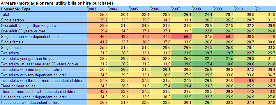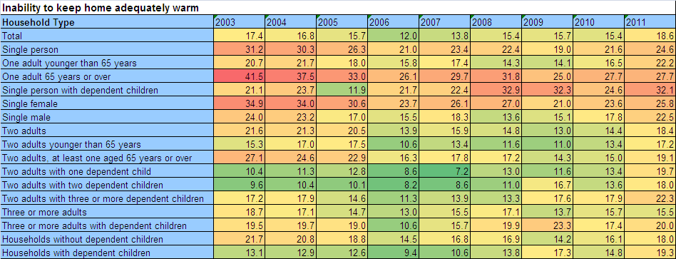 The tables in this post demonstrate the percentage of households dealing with each of the above facets of material deprivation. Worst off as you might have guessed are single parent families, families with more than two children, and people living on their own, especially older people.